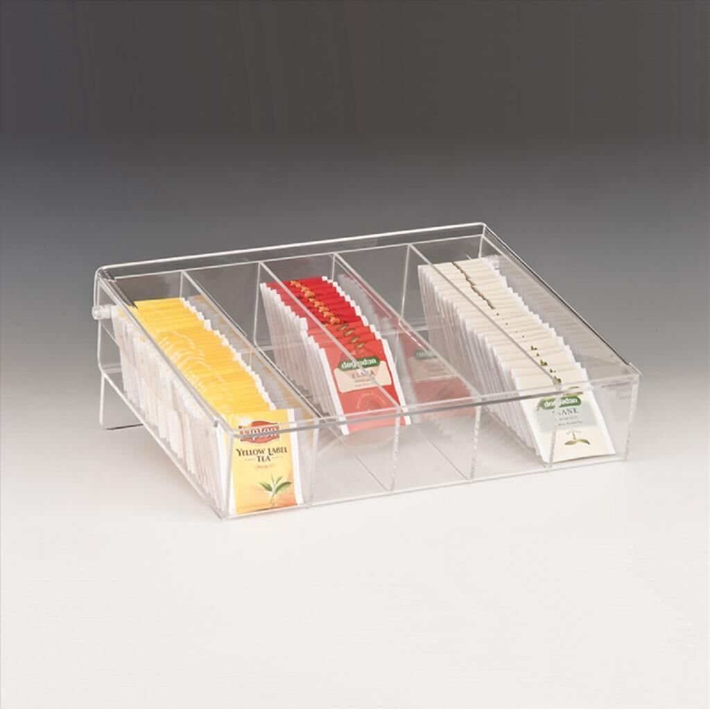 Klasik şeffaf akrilik bitki çayı standı, yemek servis istasyonunuz, büfe gibi alanlarınız için basit ama etkili bir ektir. Bu ünite, çeşitli çay poşetlerini veya çeşni paketlerini görüntülemek ve düzenlemek için beş ayrı bölüme sahiptir ve otel, kafe veya lokantanızdaki konuklarınızın favori çaylarını seçmelerini kolaylaştırır. Sade tasarımı gözleri yormaz ve personel yeniden doldurulması gerektiğini çabucak anlayabilir. Dayanıklı şeffaf akrilikten yapılmıştır, modern ve şık bir stile sahiptir ve birden fazla alanda şık bir şekilde duracağından emin olabilirsiniz!